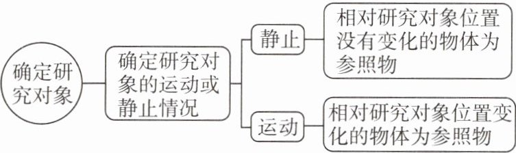 |确定研究对象→确定研究对象的运动或静止情况→静止:相对研究对象位置没有变化的物体为参照物;运动:相对研究对象位置变化的物体为参照物|