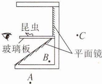 5. 用两块平面镜制作的能同时观察昆虫背部和腹部的观察箱如图所示,昆虫经下方平面镜所成的像在图中的______位置。若将昆虫沿玻璃板向镜面移动,它在平面镜中所成的像大小______。