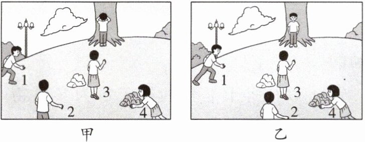 4. 如图所示,几个孩子在草地上做游戏,游戏开始时,几个孩子在草地上位置如图甲所示,当站在大树旁的小孩转过身来时,每个人的位置如图乙所示。请你判断,该过程中运动了的小孩有____(填序号1、2、3、4)。