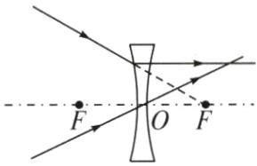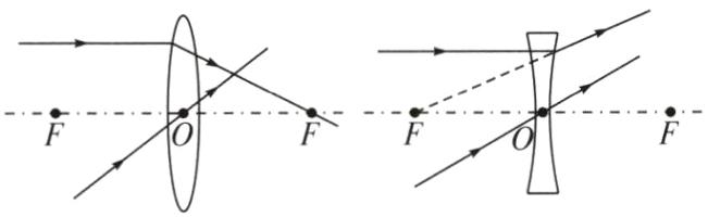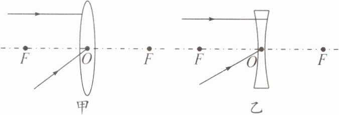 解析 题图甲中,平行于主光轴的光线经凸透镜折射后折射光线通过焦点,过凸透镜光心的光线其传播方向不变;题图乙中,平行于主光轴的入射光线经凹透镜折射后折射光线的反向延长线通过焦点,过凹透镜光心的光线传播方向不变。