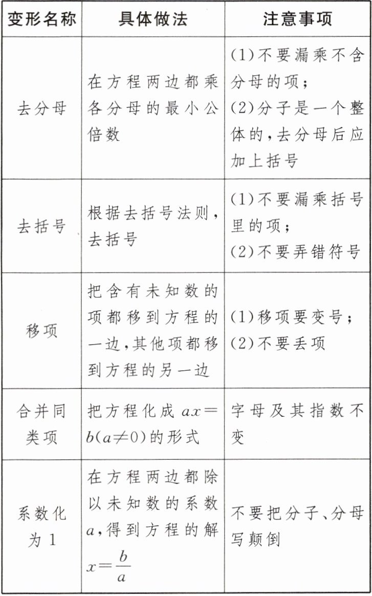 | 去分母 | 在方程两边都乘各分母的最小公倍数 | (1)不要漏乘不含分母的项;