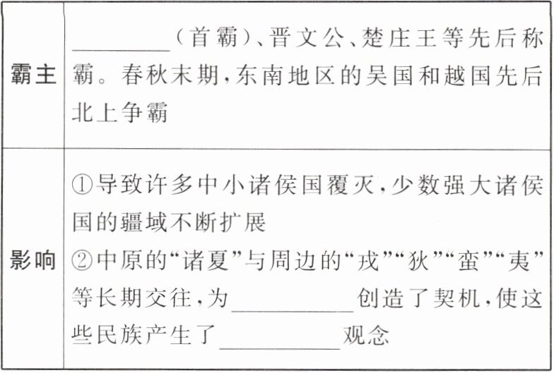 |霸主|______(首霸)、晋文公、楚庄王等先后称霸。春秋末期,东南地区的吴国和越国先后北上争霸|
