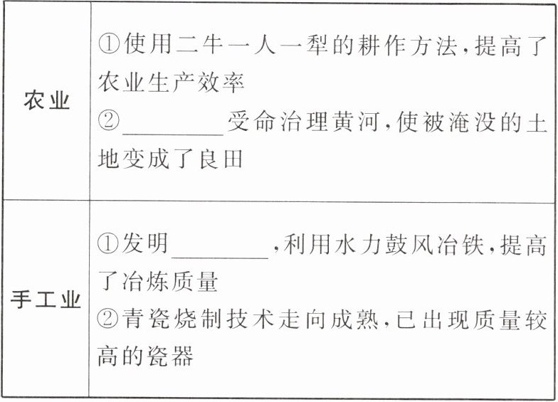 |手工业|①发明______,利用水力鼓风冶铁,提高了冶炼质量