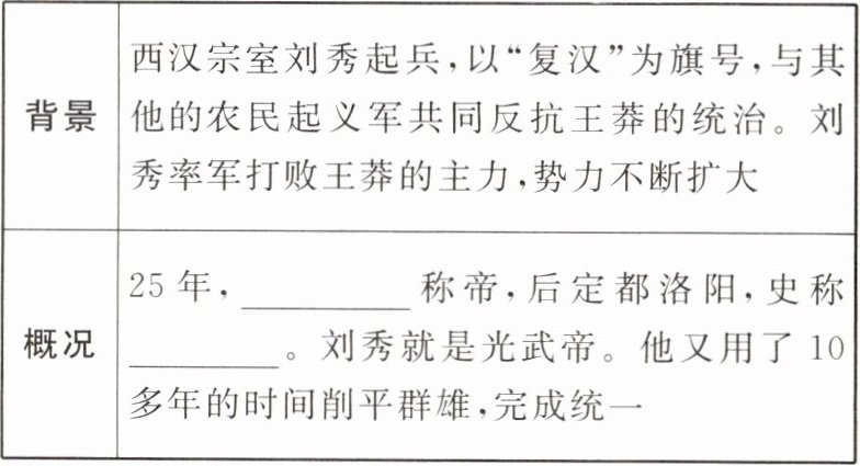 |概况|25年,______称帝,后定都洛阳,史称______。刘秀就是光武帝。他又用了10多年的时间削平群雄,完成统一|