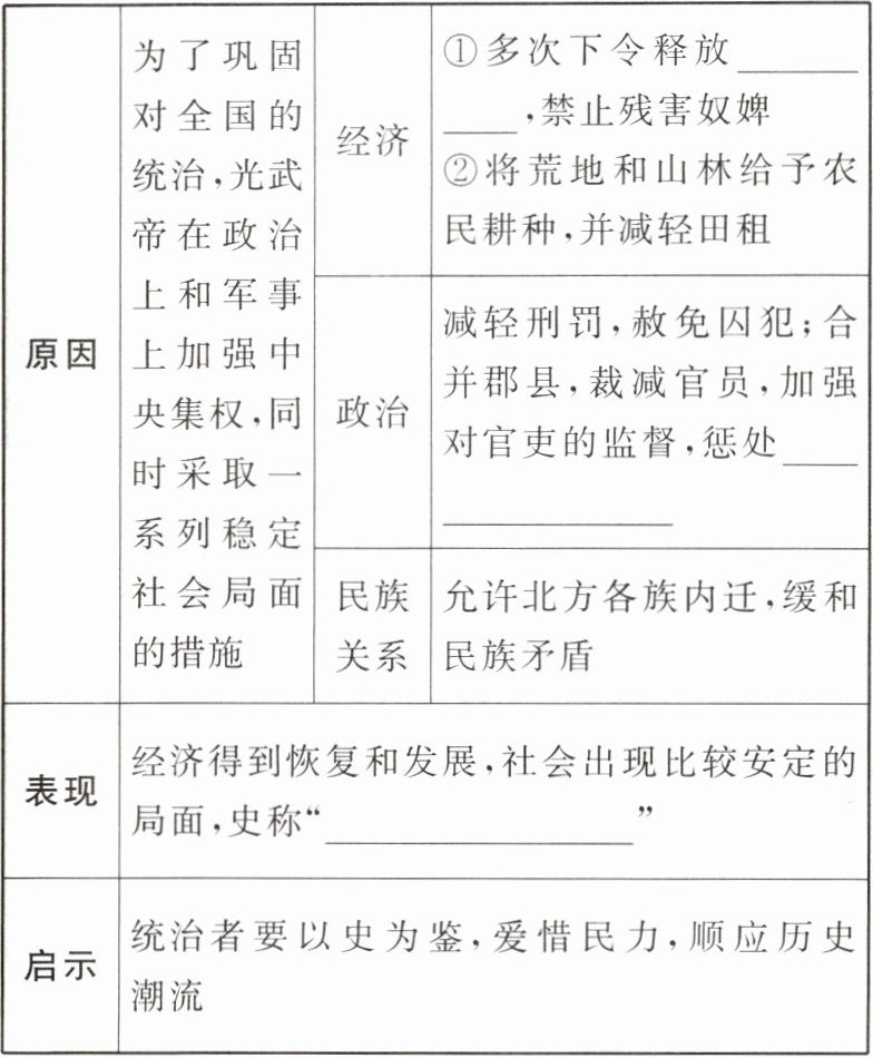 |原因|为了巩固对全国的统治,光武帝在政治上和军事上加强中央集权,同时采取一系列稳定社会局面的措施|经济|①多次下令释放______,禁止残害奴婢