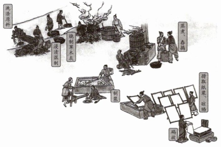 (2)原料:树皮、破布、麻头和旧渔网等。优点:原料易找,价格便宜,不仅质量大大提高,而且易于推广。