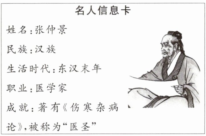 (3)上图是七年级(2)班李阳同学为张仲景制作的名人信息卡,请结合所学知识模仿李阳同学的制作模式为华佗制作一张名人信息卡。