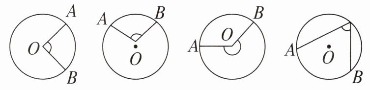 )。像 $ \angle AOB $ 这样,顶点在圆心的角叫作(圆心角