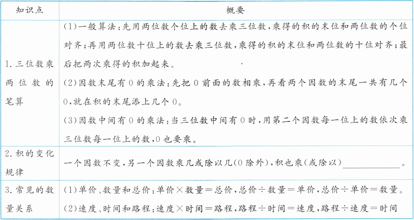 (3)因数中间有0的乘法:当三位数中间有0时,用第二个因数每一位上的数依次乘三位数每一位上的数,0也要乘。|
