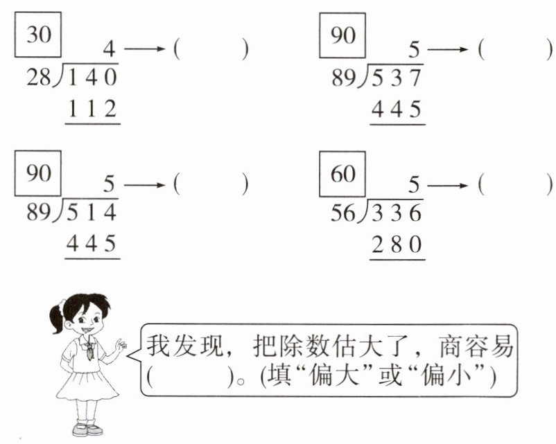 我发现,把除数估大了,商容易( )。(填“偏大”或“偏小”)