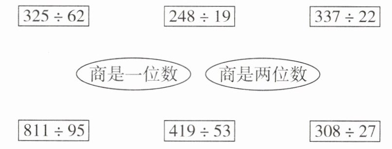 325÷62 248÷19 337÷22 商是一位数 商是两位数 811÷95 419÷53 308÷27