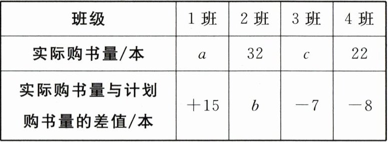 (1)每个班计划购书量为$22-(-8)=22+8=30$(本),故$a=30+15=45$,$b=32-30=+2$,$c=30-7=23$。故答案为45,+2,23。