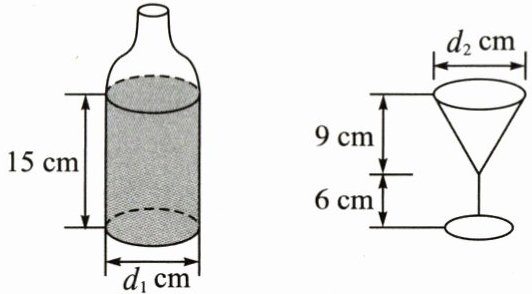 15. 一个装了一些果汁的瓶子和一个圆锥形玻璃杯如图所示,且$d_{1}=d_{2}$.如果把瓶子中的果汁全部倒人这个圆锥形玻璃杯中,最多可以倒满