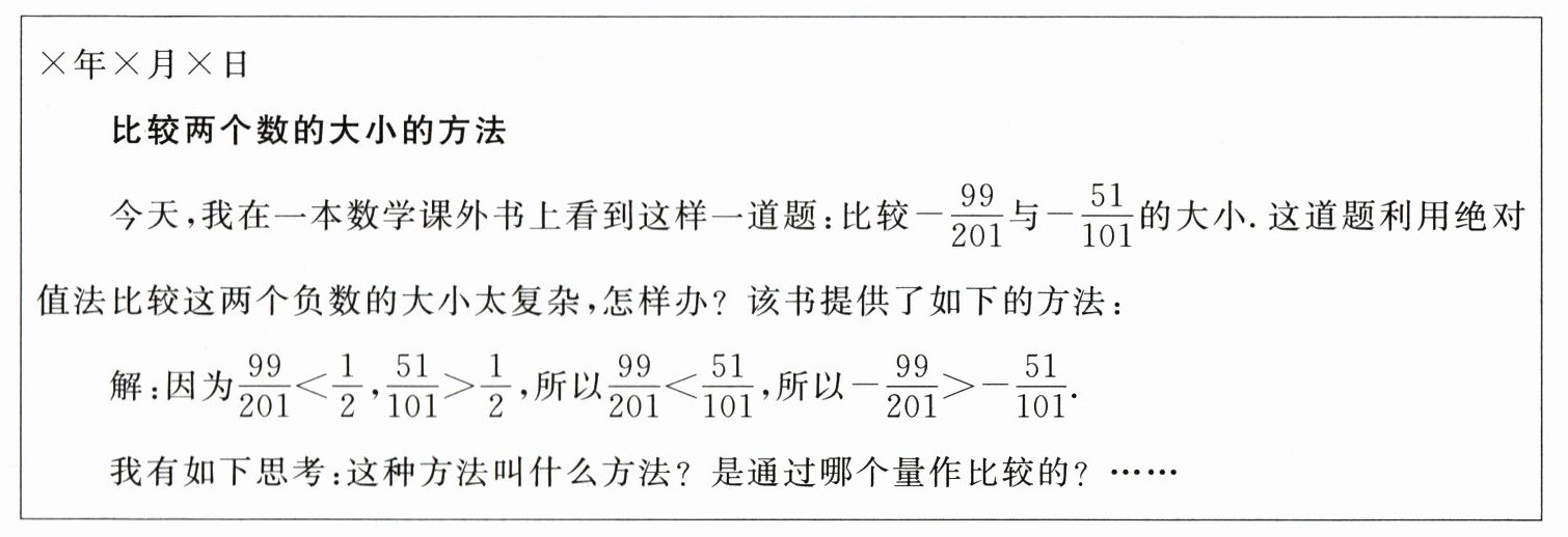(1)题干中的方法是先通过找中间量$\frac{1}{2}$来比较出$\frac{99}{201},\frac{51}{101}$的大小的,再根据两个负数比较大小,绝对值大的负数反而小,把这种方法叫作借助中间量比较法.