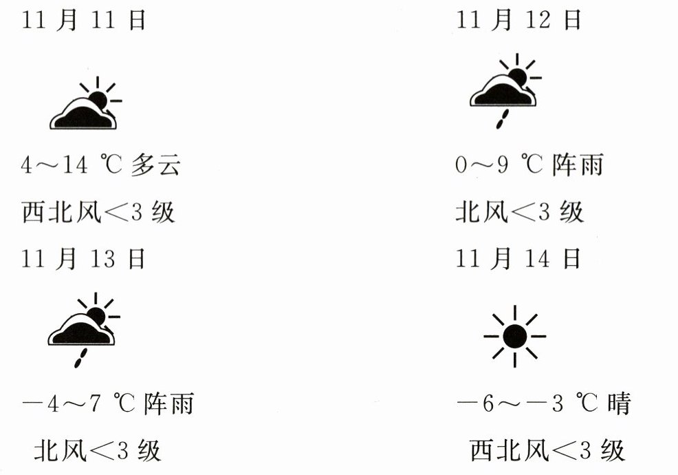 5. 某市11月份连续四天的天气预报信息如图所示,其中日温差最大的一天是(