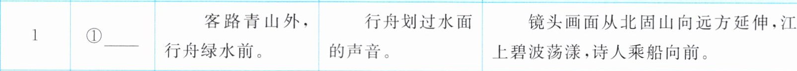 |1|$①\underline{ }$|客路青山外,行舟绿水前。|行舟划过水面的声音。|镜头画面从北固山向远方延伸,江上碧波荡漾,诗人乘船向前。|