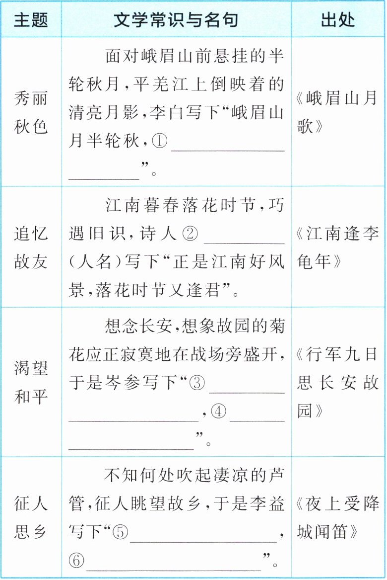①______(人名)以“峨眉山月半轮秋,②______”(《峨眉山月歌》)描绘清亮月影秀丽秋色;杜甫以“③______,④______”(《江南逢李龟年》)叙写江南暮春追忆旧友;岑参以“遥怜故园菊,⑤______”(《行军九日思长安故园》),遥想故园的菊花,表达对和平的渴望;李益以“⑥______,一夜征人尽望乡”(《夜上受降城闻笛》)描绘芦管声声,征人思乡。
