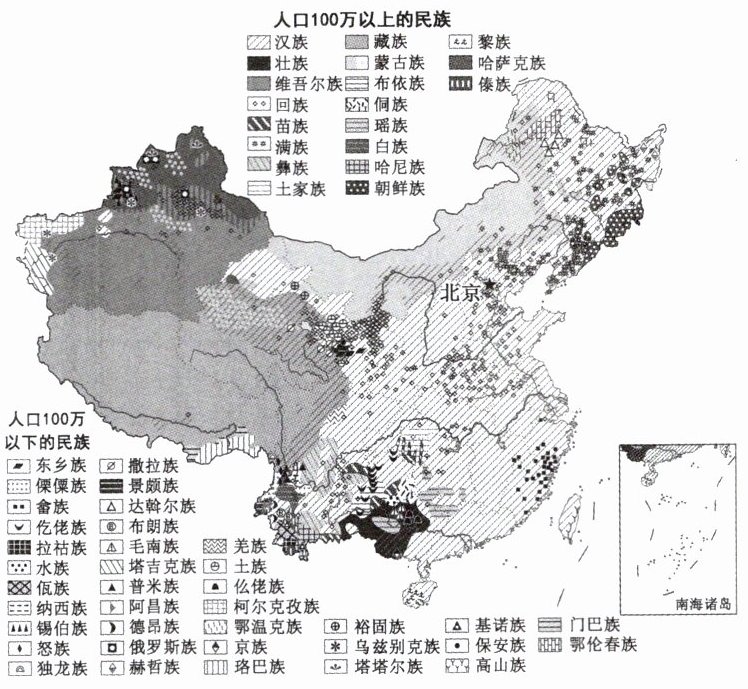 (时事热点)第十二届全国少数民族传统体育运动会于2024年11月22日至30日在海南省三亚市举办,其中,马上项目比赛提前于7月8日至13日在新疆维吾尔自治区昭苏县举行。下图示意我国民族的分布,据此完成6—7题。