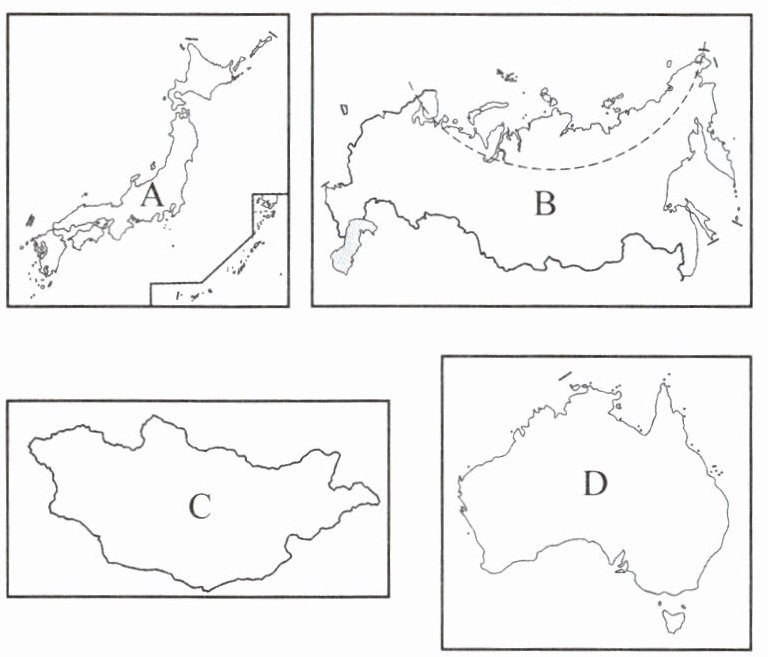 6.B(提示:读图可知,A是日本,为岛国;B是俄罗斯,是一个海陆兼备的国家,与我国的海陆位置特征具有相似性;C是蒙古,属于内陆国,不临海;D是澳大利亚,是世界上唯一独占整个大陆的国家,四面临海) 7.D