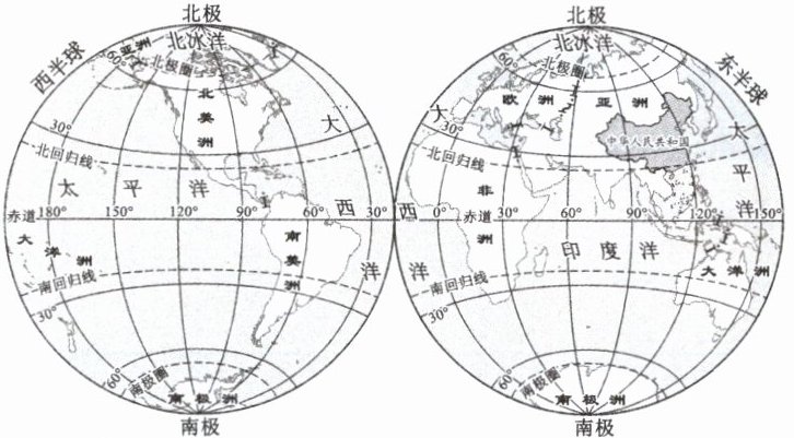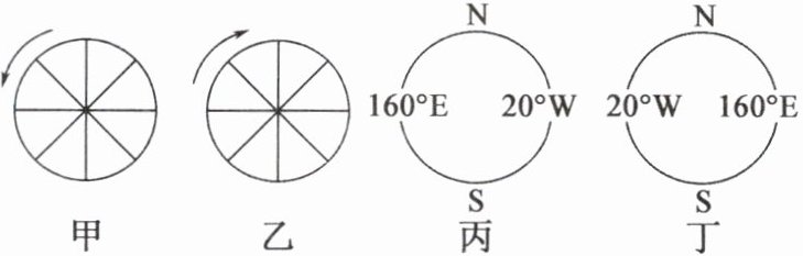 5.B(提示:从北极上空俯视,地球呈逆时针方向自转;从南极上空俯视,地球呈顺时针方向自转,据此判断甲为北半球,乙为南半球。20°W和160°E组成的经线圈是东西半球的分界线,20°W往东至160°E属于东半球,20°W往西至160°E属于西半球,据此判断丙为西半球,丁为东半球。我国位于北半球、东半球)