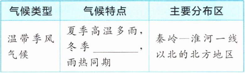 |温带季风气候|夏季高温多雨,冬季______,雨热同期|秦岭—淮河一线以北的北方地区|