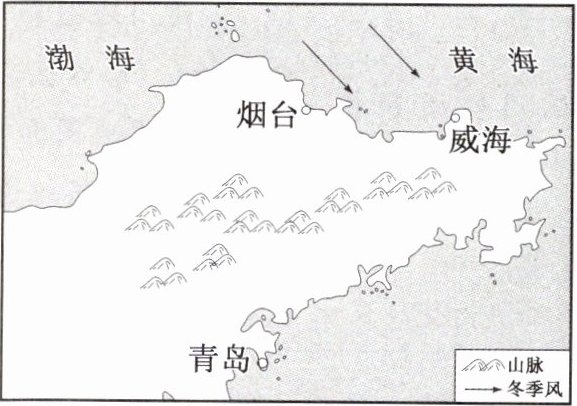 (综合思维)每年冬季,山东半岛的北部降雪量较多,烟台和威海是著名的“雪窝”。下图示意山东半岛地形和冬季盛行风向示意图,完成10—11题。