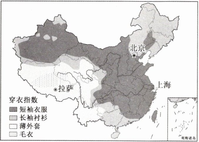 (生活实践)穿衣指数是根据自然环境对人体感觉温度的影响,以及对天气状况、气温、湿度、风等气象要素的分析研究,从中总结出的一种旨在提醒人们看天穿衣的气象指数。穿衣指数共分8级,指数越小,穿衣的厚度也就越薄。读某日我国穿衣指数分布示意图,完成4—5题。