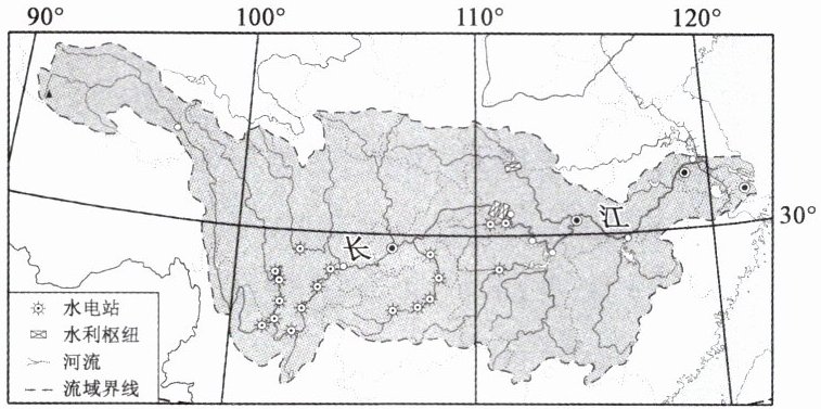 (1)长江流域面积广,支流多,流域内降水丰富。