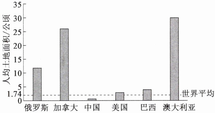 读2020年世界面积前六的国家人均土地面积比较图,完成5—6题。