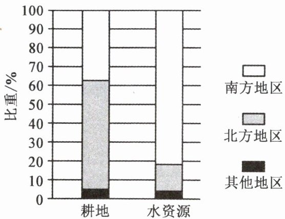 4. 对比南、北方地区耕地和水资源的配置情况,可以得出的结论是( )
