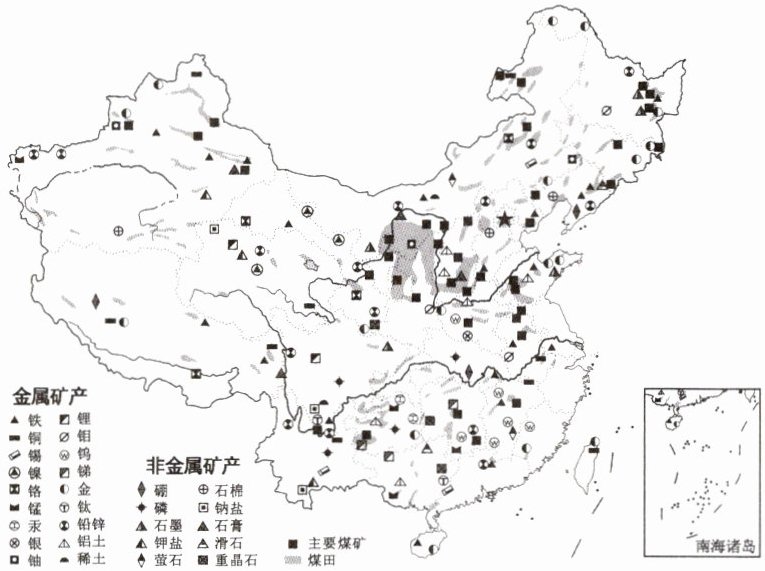 读我国主要矿产资源分布图,完成 5—6 题。(我国主要矿产资源分布图)