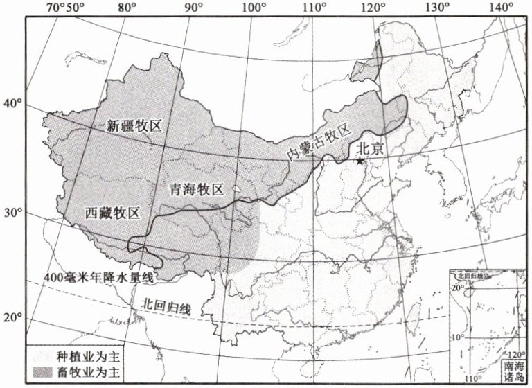 读我国农业区域差异及主要牧区分布图,完成 9—10 题。