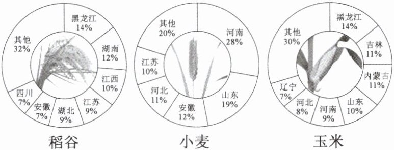 (综合思维)读 2020 年我国出产稻谷、小麦、玉米的主要省级行政区示意图,完成 3—4 题。