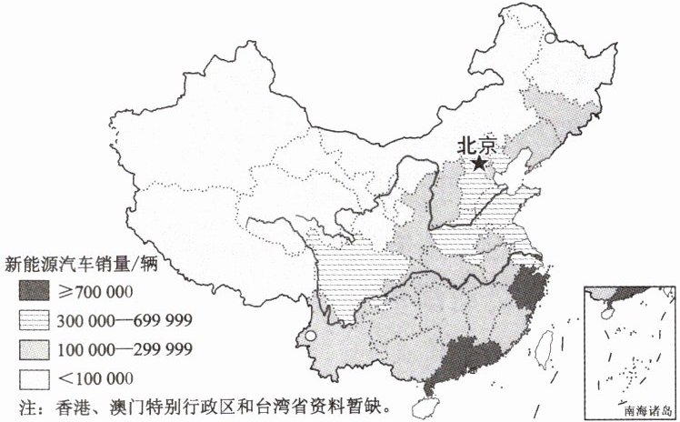 (3) 读图可知,新能源汽车销量最高的两个省级行政区分别是______省和______省。这两个省的地区生产总值(GDP)均位于全国前列,体现出______发展水平的高低,对汽车销售的市场规模的影响也较大。