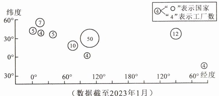 (综合思维) “灯塔工厂”指大规模应用人工智能、大数据分析、5G 等新技术,全方位推动制造业全过程、价值链和商业模式转型的示范性工厂或企业,是拥有足够的科技含量与创新性的“世界最先进的工厂”。下图示意世界“灯塔工厂”分布的主要国家及工厂数,据此完成 13—14 题。