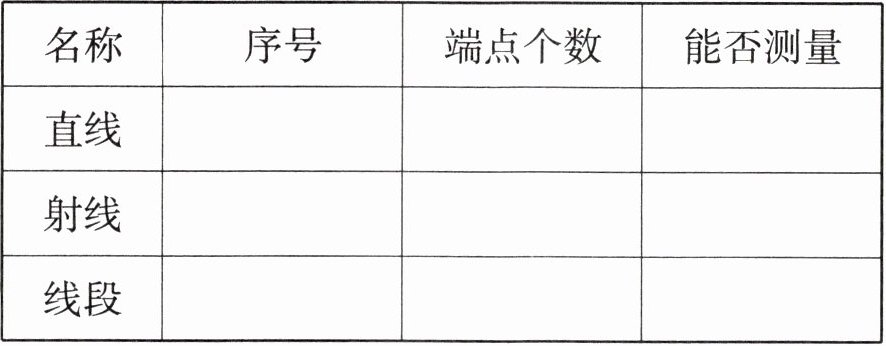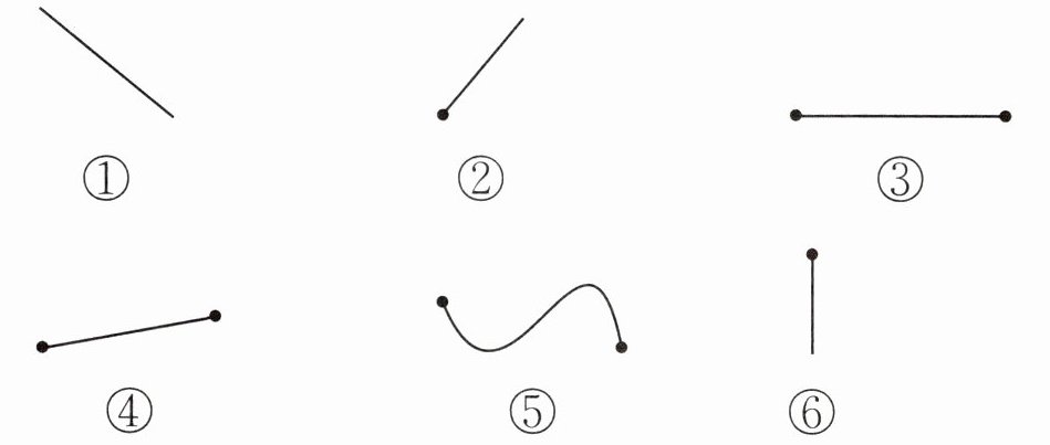 【解析】:直线没有端点,无限长,不能测量,对应序号①;射线有1个端点,无限长,不能测量,对应序号②⑥;线段有2个端点,有限长,能测量,对应序号③④。