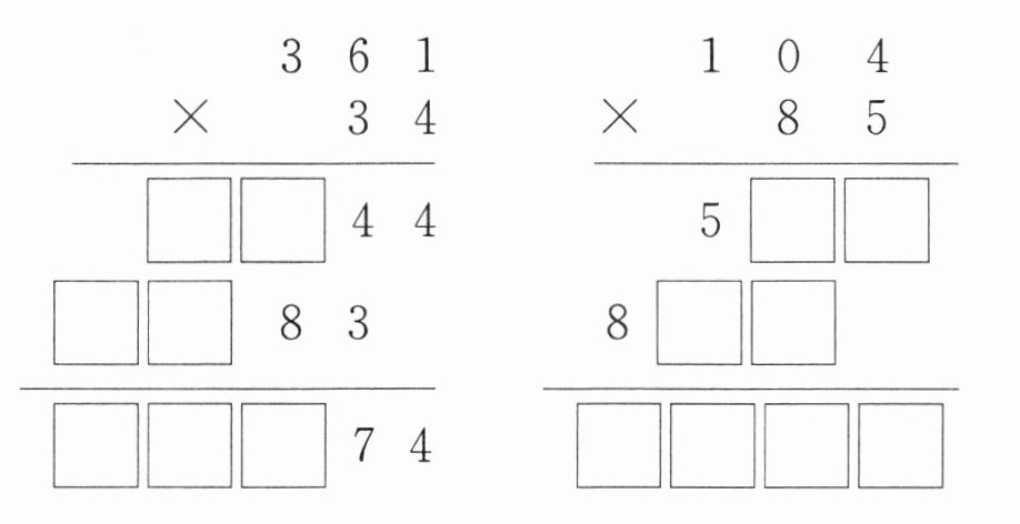 $\begin{array}{r}104 \\× 85 \\\hline5 □ □ \\8 □ □ \\\hline□ □ □ □ \\\end{array}\\\hline□ □ □ □ \\ $