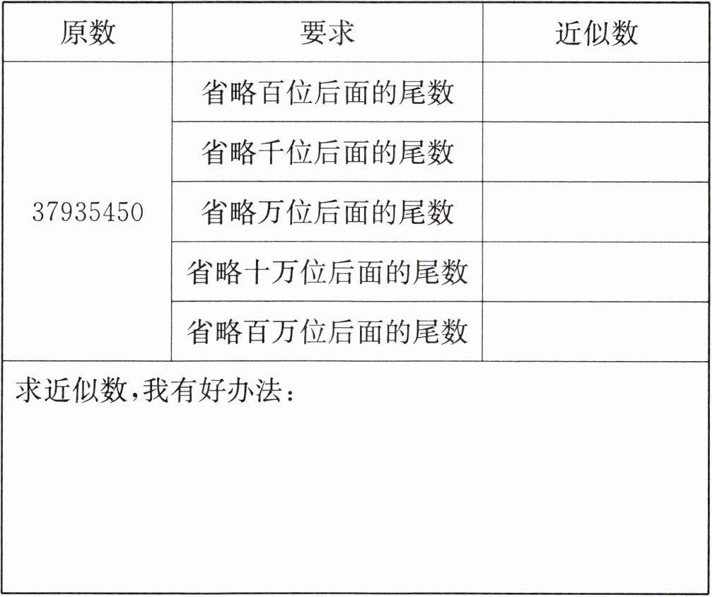 小技巧 求近似数,首先确定省略哪一位后面的尾数,再根据省略的尾数部分的最高位上的数进行“四舍”或“五入”。