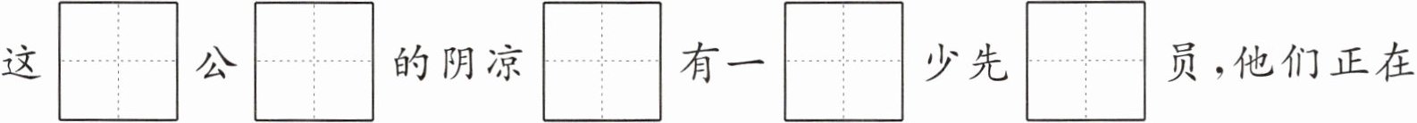 这$\begin{array}{|c|c|}\hline & \\\hline & \\\hline\end{array}\begin{array}{|c|c|}\hline & \\\hline & \\\hline zuò$公$\begin{array}{|c|c|}\hline & \\\hline & \\\hline\end{array}\begin{array}{|c|c|}\hline & \\\hline & \\\hline yuán$的阴凉$\begin{array}{|c|c|}\hline & \\\hline & \\\hline\end{array}\begin{array}{|c|c|}\hline & \\\hline & \\\hline chù$有一$\begin{array}{|c|c|}\hline & \\\hline & \\\hline\end{array}\begin{array}{|c|c|}\hline & \\\hline & \\\hline qún$少先$\begin{array}{|c|c|}\hline & \\\hline & \\\hline\end{array}\begin{array}{|c|c|}\hline & \\\hline & \\\hline duì$员,他们正在练习吹铜号呢。