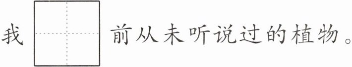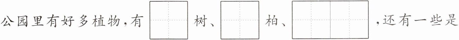 公园里有好多植物,有$\begin{array}{|c|}\hline yáng \\ \hline \end{array}\\ \hline $树、$\begin{array}{|c|}\hline sōng \\ \hline \end{array}\\ \hline $柏、$\begin{array}{|c|c|}\hline jīn & guì \\ \hline \end{array}\\ \hline $,还有一些是我$\begin{array}{|c|}\hline zhī \\ \hline \end{array}\\ \hline $前从未听说过的植物。