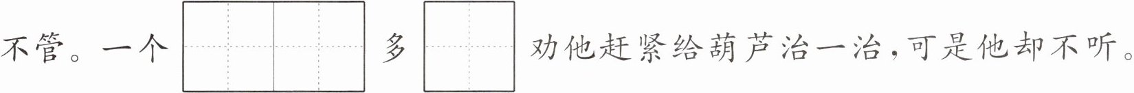 葫芦的人只$xiǎng\begin{array}{|c|}\hline \\ \hline \end{array}\begin{array}{|c|}\hline \\ \hline $着小葫芦,连那$kē\begin{array}{|c|}\hline \\ \hline \end{array}\begin{array}{|c|}\hline \\ \hline $葫芦的叶子上生了蚜虫也不管。一个$lín jū\begin{array}{|c|c|}\hline & \\ \hline \end{array}\begin{array}{|c|c|}\hline & \\ \hline $多$cì\begin{array}{|c|}\hline \\ \hline \end{array}\begin{array}{|c|}\hline \\ \hline $劝他赶紧给葫芦治一治,可是他却不听。