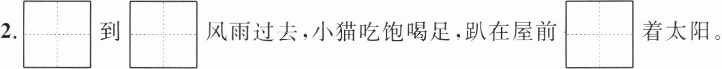 $2. \begin{tabular}{|c|} \hline děng \\ \hline \end{tabular}\\ \hline 到 \begin{tabular}{|c|} \hline bào \\ \hline \end{tabular}\\ \hline $风雨过去,小猫吃饱喝足,趴在屋前$ \begin{tabular}{|c|} \hline shài \\ \hline \end{tabular}\\ \hline $着太阳。