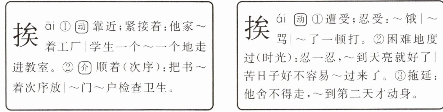 |挨|ái 动①遭受;忍受:~饿|~骂|~了一顿打。②困难地度过(时光):忍一忍,~到天亮就好了|苦日子好不容易~过来了。③拖延:他舍不得走,~到第二天才动身。|