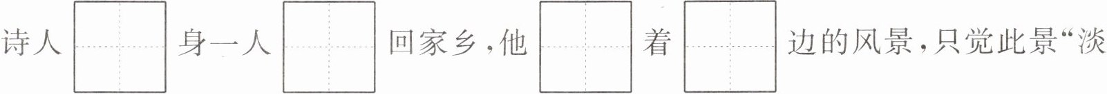 诗人$\begin{array}{|c|}\hline gū \\ \hline \end{array}\\ \hline 身一人\begin{array}{|c|}\hline fǎn \\ \hline \end{array}\\ \hline $回家乡,他$\begin{array}{|c|}\hline wàng \\ \hline \end{array}\\ \hline 着\begin{array}{|c|}\hline àn \\ \hline \end{array}\\ \hline $边的风景,只觉此景“淡妆浓$\begin{array}{|c|}\hline mǒ \\ \hline \end{array}\\ \hline 总相\begin{array}{|c|}\hline yí \\ \hline \end{array}\\ \hline $”。