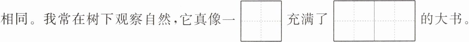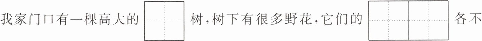 我家门口有一棵高大的 $\begin{array}{|c|}\hline lí \\ \hline \end{array}\\ \hline $ 树,树下有很多野花,它们的 $\begin{array}{|c|c|}\hline zī & tài \\ \hline \end{array}\\ \hline $各不相同。我常在树下观察自然,它真像一 $\begin{array}{|c|}\hline bù \\ \hline \end{array}\\ \hline $ 充满了 $\begin{array}{|c|c|}\hline ào & mì \\ \hline \end{array}\\ \hline $ 的大书。