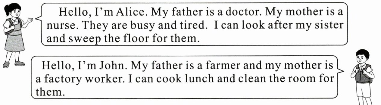 Hello, I’m Alice. My father is a doctor. My mother is a nurse. They are busy and tired. I can look after my sister and sweep the floor for them.