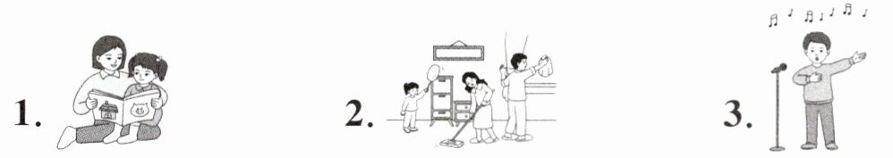 It's 6:00 in the evening. Amy's family are all at home. Look! Amy is drawing a picture. Her father is reading a book. Her mother is cooking in the kitchen. Her brother Jim is cleaning the room. Her sister Lucy is singing old songs.
