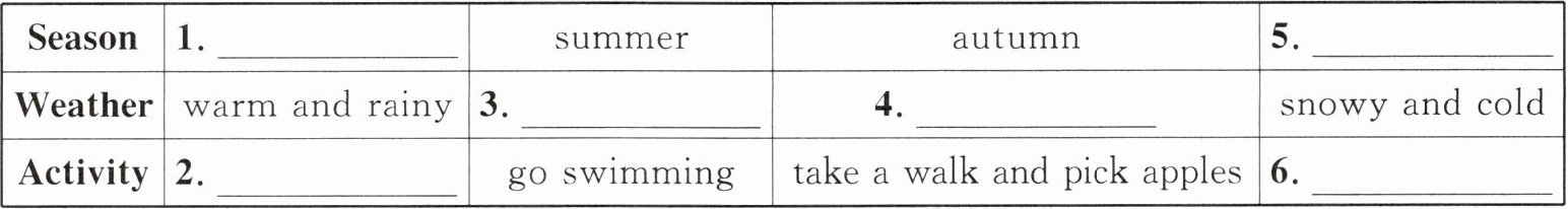 1. spring 2. plant trees and flowers 3. sunny and hot 4. windy and cool 5. winter 6. make a snowman