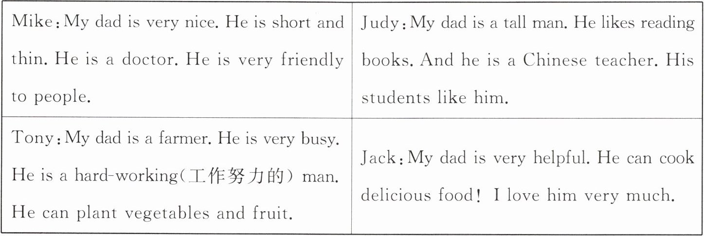 |Mike: My dad is very nice. He is short and thin. He is a doctor. He is very friendly to people.|Judy: My dad is a tall man. He likes reading books. And he is a Chinese teacher. His students like him.|