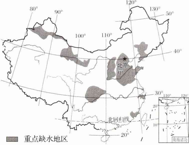 下图为我国重点缺水地区分布图。据此完成下列各题。